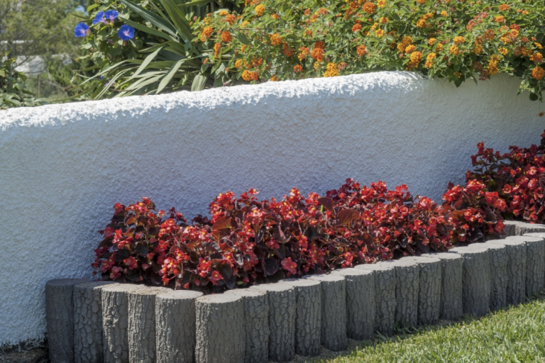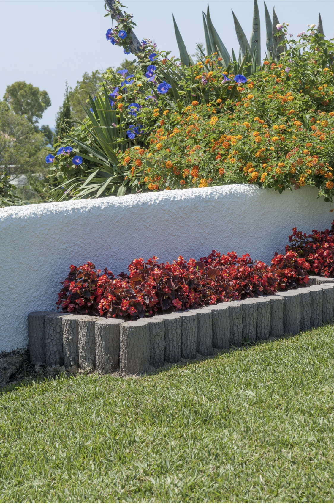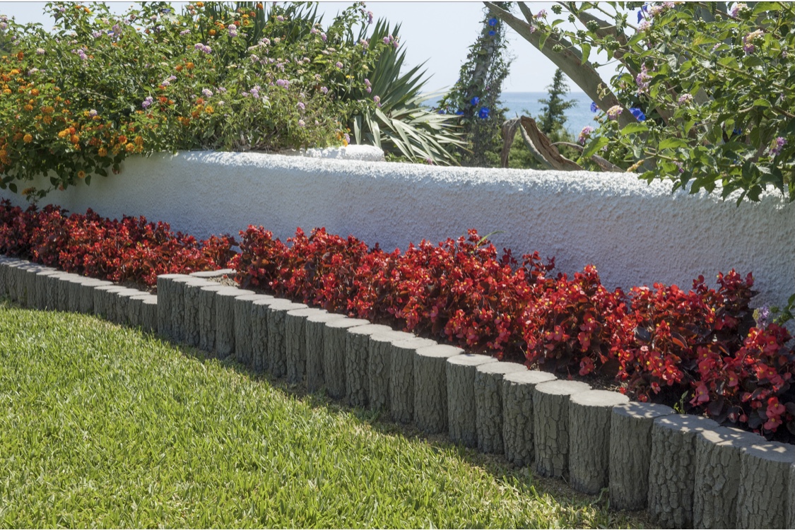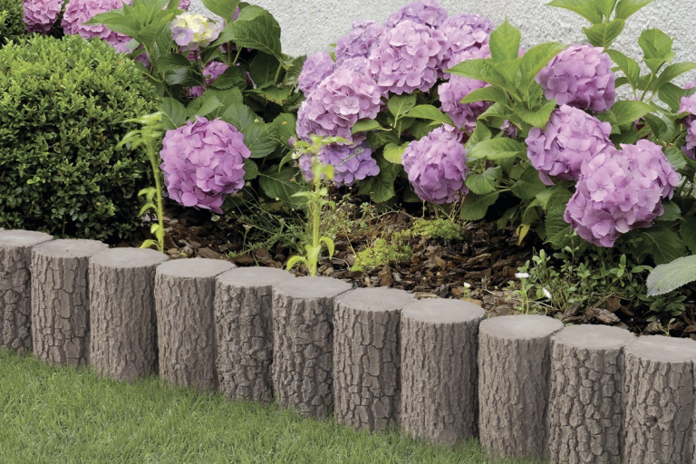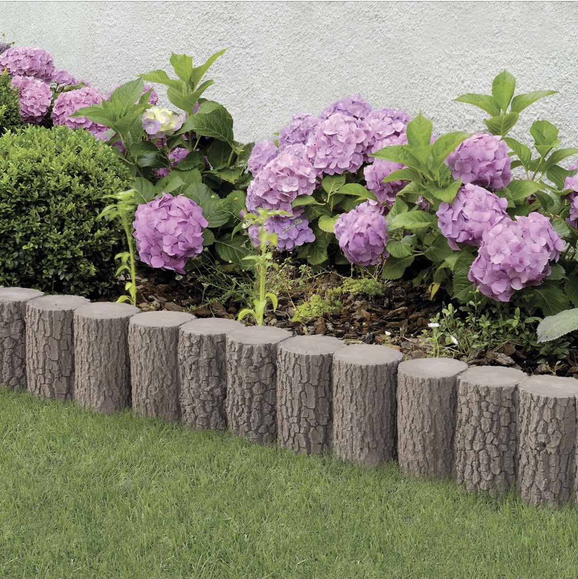 Bordillo de aspecto de tronquitos de madera para delimitar pequeños parterres en el jardín.